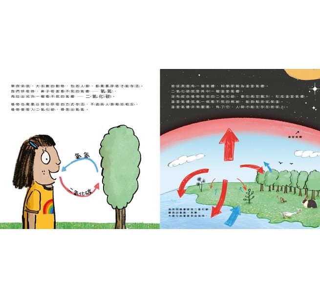 每當我們燃燒東西,無論是汽油引擎或是燃煤發電,都會排放出一種叫做「二氧化碳」的氣體,它是「溫室氣體」的一種,是維持地球溫暖的重要保護,可是一旦累積過多的溫室氣體,地球就會變得越來越熱,進而引發一連串的連鎖效應。氣候變遷不僅會造成森林大火、颶風等極端氣候,也害許多動物無法覓食,甚至失去棲息地,導致生態平衡受威脅……美麗的地球在全球暖化的過程中,逐漸失去原有的樣貌。