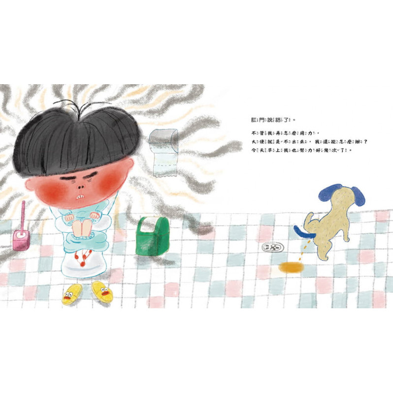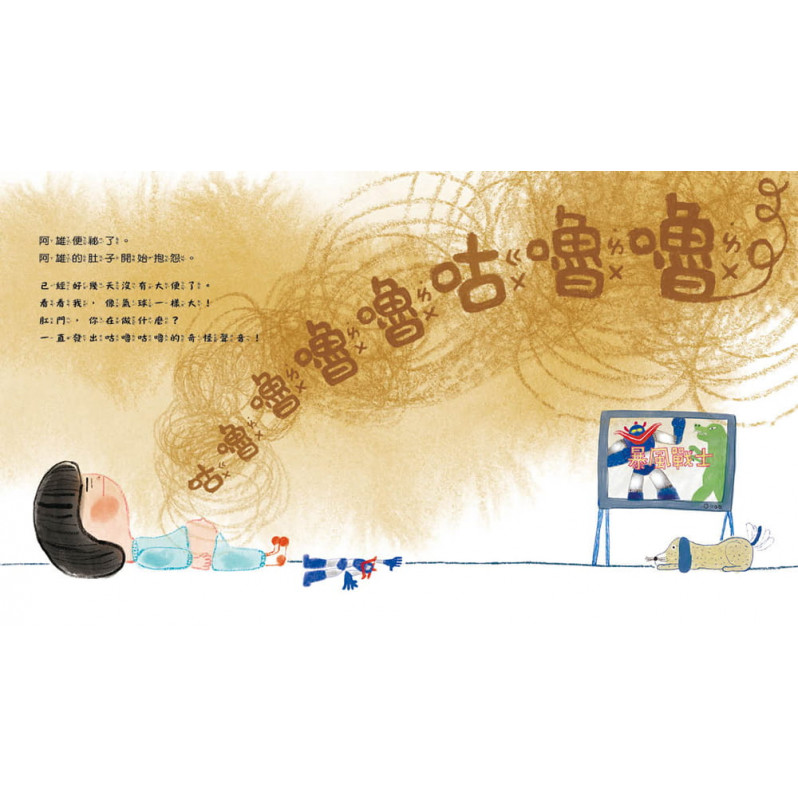 繼《哈啾!我感冒了》作者千美眞再度攜手繪者李芝殷,以貼近孩童的敘述方式,搭配故事主角誇張生動的傳神表情,以轉換各器官的視角來傳達便秘的症狀,以及造成便秘的生活習慣。從眼睛的視角、耳朵的視角、屁股的視角、鼻子的視角,甚至是大便的視角,再到阿雄的視角。讓孩子隨著書中的主角歷經一次痛苦的便秘經驗,回想自己平時是否也有與阿雄相同的習慣,了解飲食與排泄之間的關係,建立初步的消化系統概念。