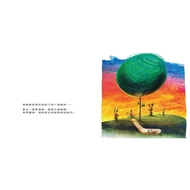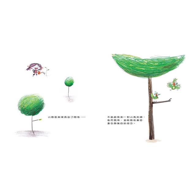 另一根樹枝也漸漸地從樹上長出來……路過的兔子家族覺得這是安家的好地方。所以現在有:2根樹枝、2隻鳥、3個雞蛋、4隻兔子。五顆水果長在樹上。六隻蜜蜂正在尋找一根完美的樹枝,當作築蜂巢的地方。所以現在有:2根樹枝、2隻鳥、3個雞蛋、4隻兔子、5顆水果、6隻蜜蜂。故事就這樣從種下一棵樹開始,慢慢地衍生出一個生態豐富的森林,物種愈來愈豐富多樣,生命也愈來愈繁榮。一個小小的種樹舉動就讓我們的自然產生如此大的變化,為這世界帶來更多的美好。透過這本書,相信可以讓孩子們感受到種樹的重要性,也能讓他們體會到其實有時候,隨手可以做到的一件小事,在不知不覺間,就會產生巨大的改變。