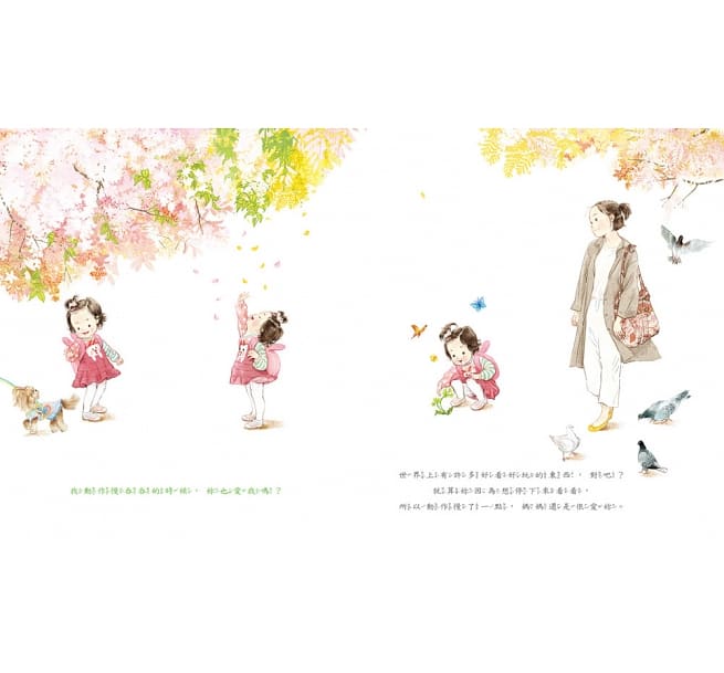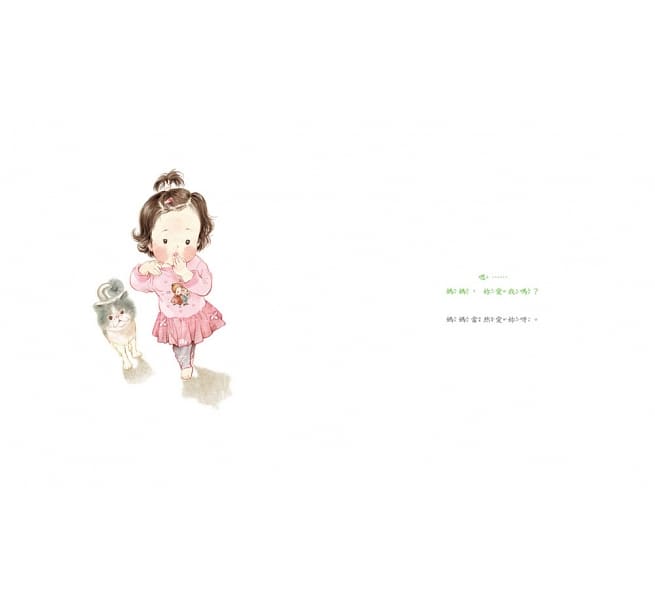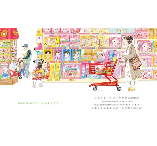 「媽媽,妳愛我嗎?」小女孩抬起頭來,有點緊張地看著媽媽。直到聽見那句「媽媽當然愛妳呀!」她鬆了一口氣,可是很快又接著問,那我動作慢吞吞的時候呢?我好膽小,不敢打針,在診所裡哭哭的時候呢?我在玩具店裡鬧脾氣耍賴的時候呢?還有上台表演不小心出錯的時候……媽媽也愛我嗎?