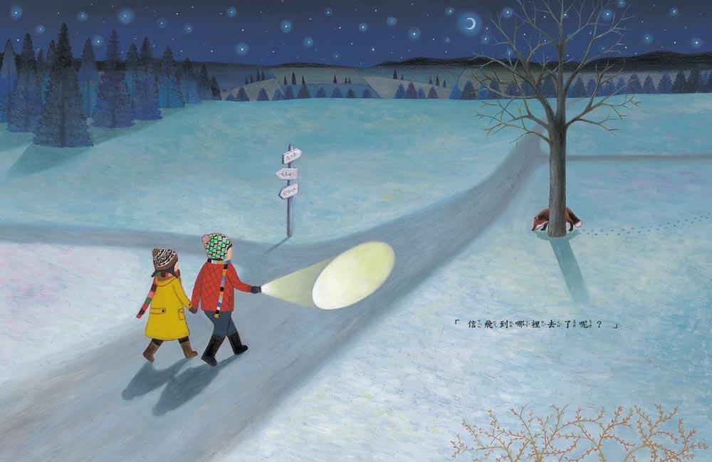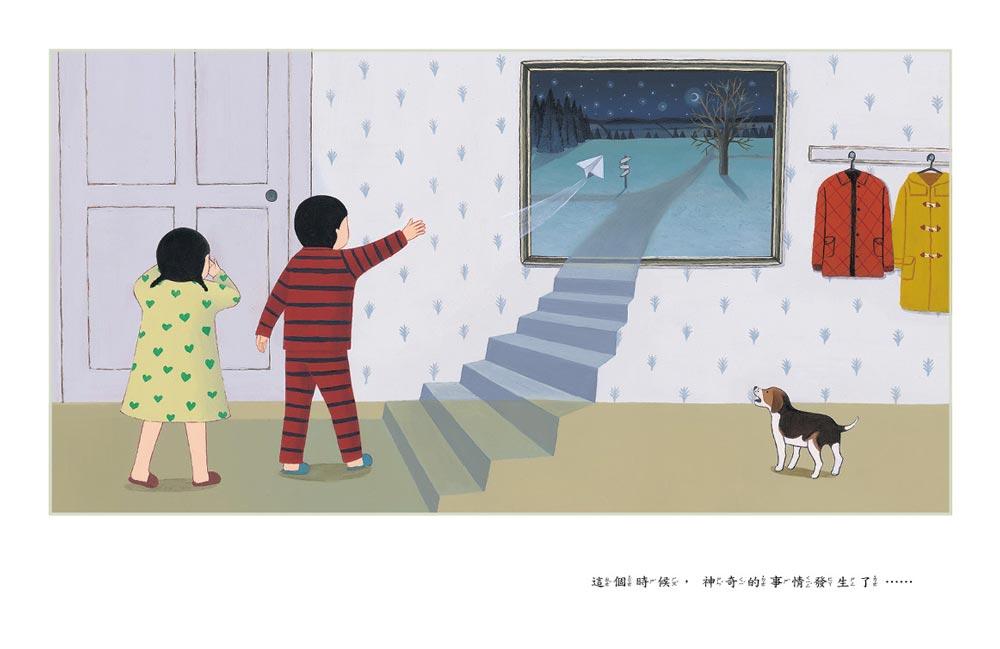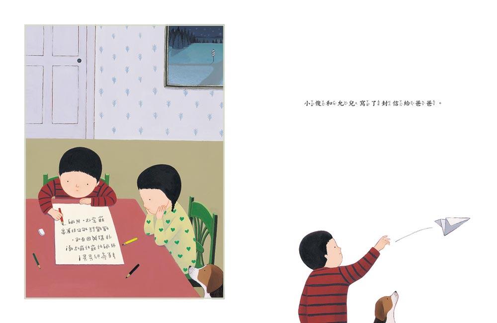 於是,小俊和允兒寫了封信給想念的爸爸,然後他們將信摺成紙飛機射了出去。神奇的事情發生了,紙飛機承載著小俊和允兒想見爸爸的願望,飛進掛在牆上的畫裡了。小俊和允兒就跟著消失在畫裡面的紙飛機,開始了一段尋找寧靜國度的旅程。