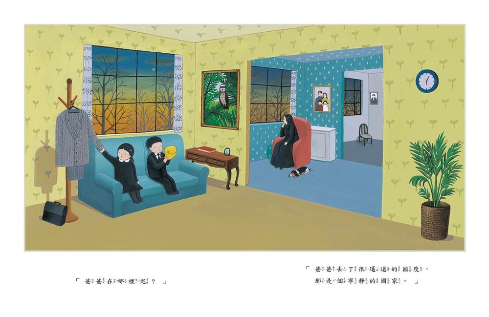 透過想像、夢境,小兄妹理解了爸爸住的寧靜國度很美麗。爸爸住在那裡,也住在他們的回憶裡。孩子,於是可以安心的好好睡覺。也好好過著爸爸不在身邊的未來日子。