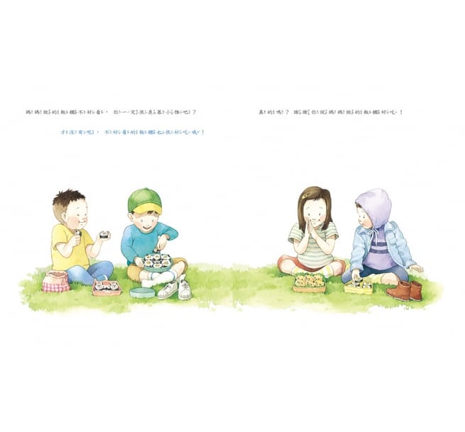 自己捏的飯糰沒有其他小朋友媽媽捏的造型可愛、又忍不住對孩子發脾氣了、因為忙過頭而太晚去接孩子……媽媽總是用最高的標準要求自己,時常反省自己哪裡做得不夠好、對孩子感到愧疚,可是當媽媽不好意思地向孩子道歉時,孩子卻看著媽媽的眼睛笑咪咪地說:「但我還是最喜歡媽媽!全世界最棒的媽媽!」