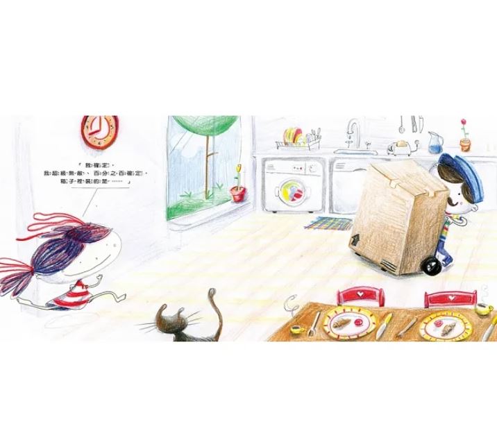 但是,待在紙箱裡,可是件無聊的事呀!總得想想辦法打發時間吧!等到四下無人時,小女孩爬出了紙箱,開始動手改造紙箱。她把紙箱做成賽車,在客廳賽起車來;她又把紙箱做成飛機,把沙發當峽谷,大戰貓怪;後來又把紙箱改造成太空艙,翱翔天際。就這樣利用一個簡單的紙箱,不需要多麼先進的科技,也不需要昂貴的旅費,小女孩乘著想像力,上天下海,徜徉在她的冒險世界裡。一個紙箱加上想像力,將小女孩帶到了腳踏車也到不了的地方。