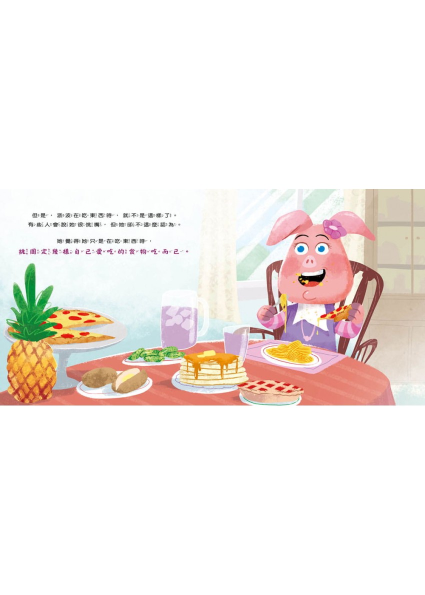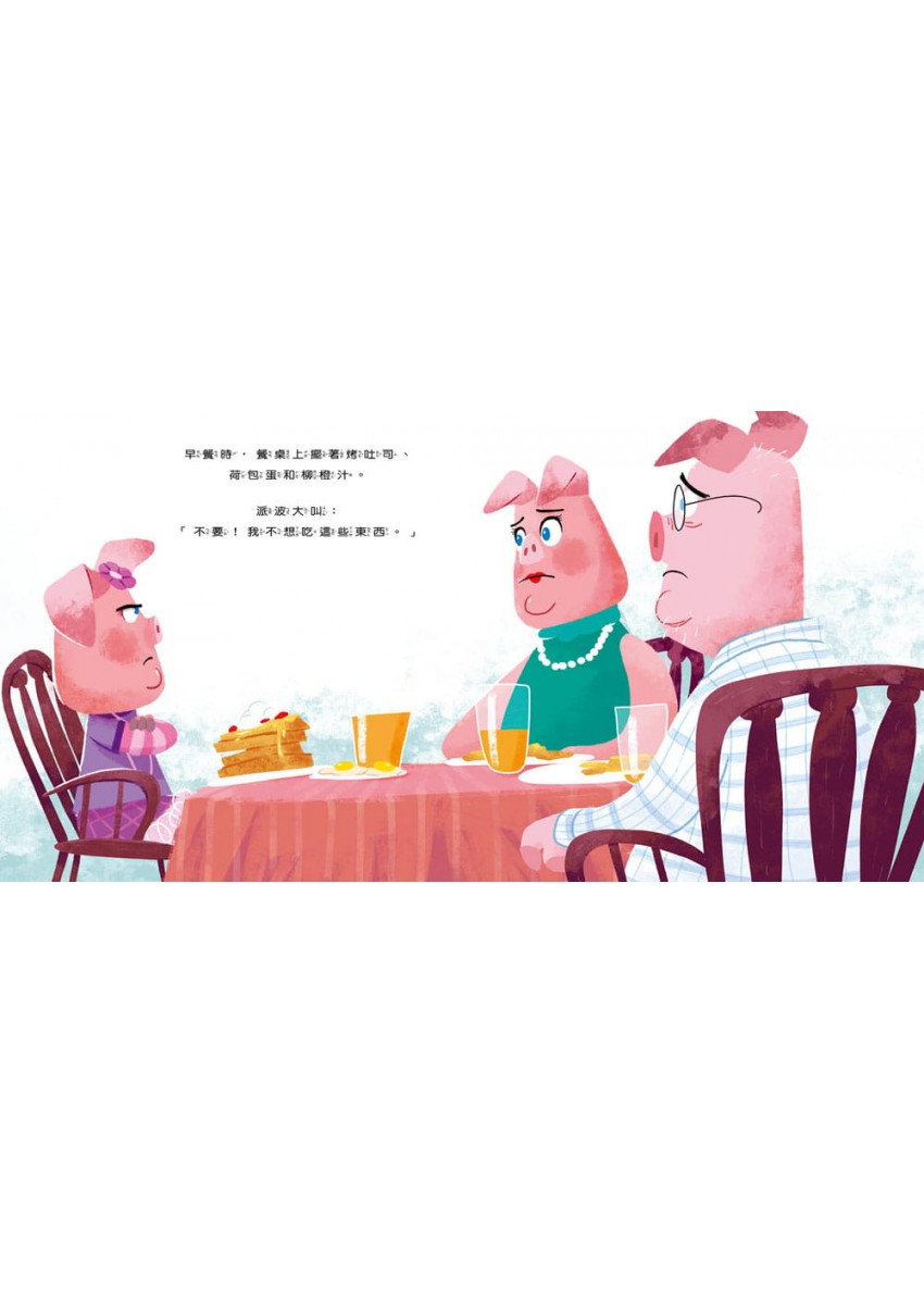 故事中媽媽對派波的挑食很挫折,隨著時間漸漸失去耐心,終於對她說如果不吃飯,在餐桌上請不要說話。派波無聊得什麼事也不能做,只能靜靜看著爸爸媽媽吃飯。過了一陣子,漸漸感到肚子餓的派波,才終於開口吃東西,沒想到一口接著一口,很快就把晚餐吃完了。父母不僅鬆了一口氣,也不忘對派波把食物吃光光的行為給予讚許。