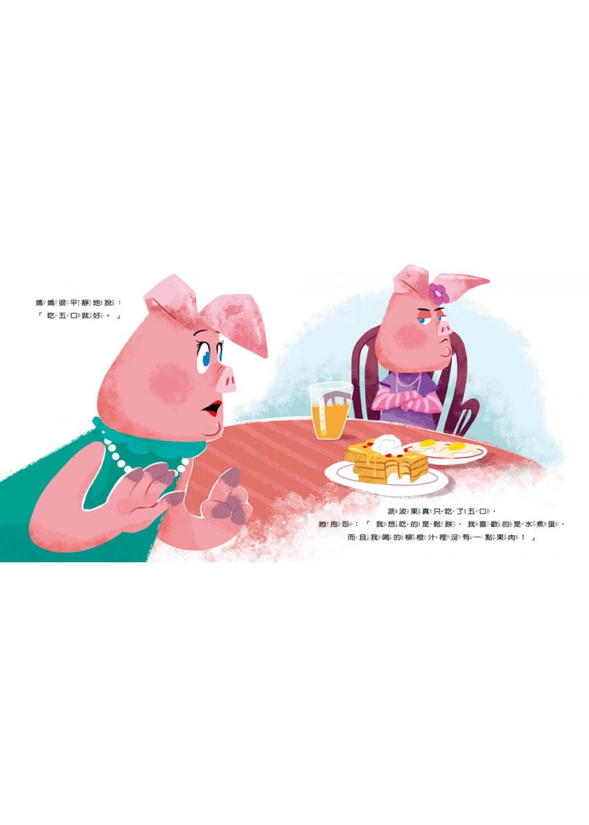 故事中的爸爸媽媽就像每位為孩子的挑食而頭痛不已的家長,除了描繪出無奈的心情,更能體會得到為孩子想方設法的用心。