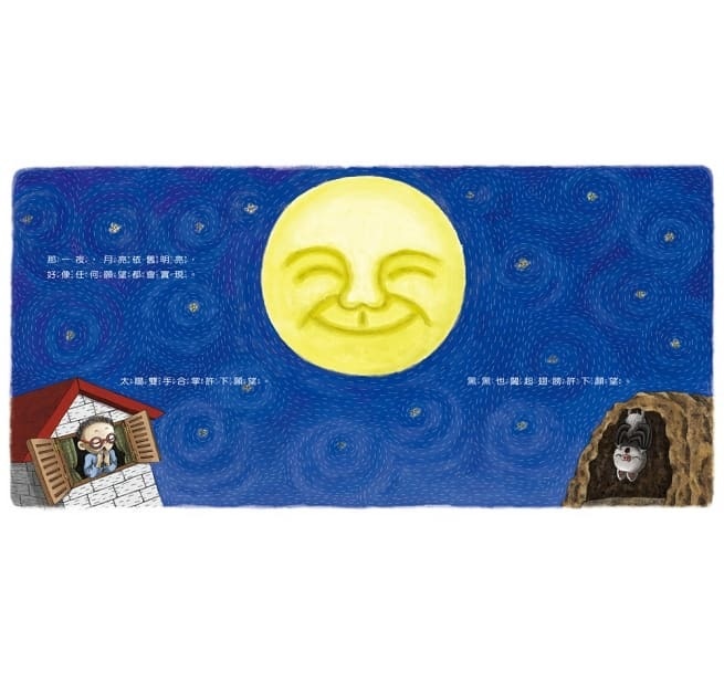 小男孩太陽討厭晚上,因為晚上只能躺著睡覺,不能出去玩好玩的遊戲;蝙蝠黑黑也討厭晚上,因為晚上得外出飛行活動,不能待在被窩裡好好睡覺。有一天,一個月亮高掛的夜晚,太陽與黑黑不約而同地對月亮雙手合掌許下願望,令人驚奇的事情發生了,當天晚上太陽與黑黑的靈魂對調,實現彼此的願望了!