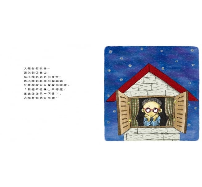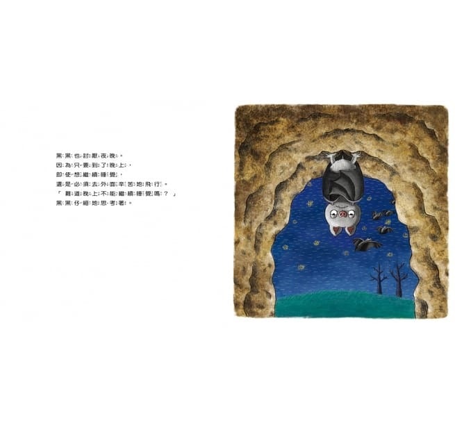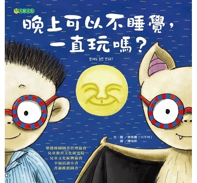 為什麼要睡覺?晚上出來玩會怎麼樣?白天為什麼不能繼續睡覺?作者以幽默有趣的故事,替每個夜晚總捨不得睡的孩子們解答疑問。日出而作、日落而息的規律作息,是人體二十四小時調配體力的奇妙機制,藉由男孩與蝙蝠短暫互換身分,不僅讓男孩一探究竟在晚上玩耍的神祕感,更體會到如果沒有足夠的睡眠時間,白天也沒有精神與體力玩耍。讓孩子確實知道生活作息為何如此,也就比較能心甘情願晚上爬上床好好睡覺了。