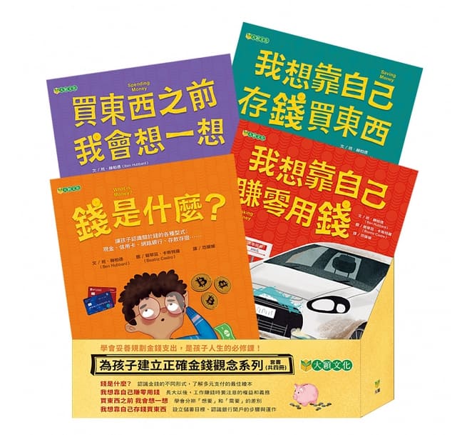 《為孩子建立正確金錢觀念套書》精選四冊圖書,從不同的層面切入,和孩子一起聊聊金錢在我們日常生活中的實際應用。在主題式繪本的引導下,把那些過去我們常對孩子說「長大你就會知道」、大人擔心孩子可能不容易理解的基礎金錢知識,以淺白的文字融入精彩的故事中,相信一定可以成為孩子在這堂人生必修課上最可靠的好夥伴!