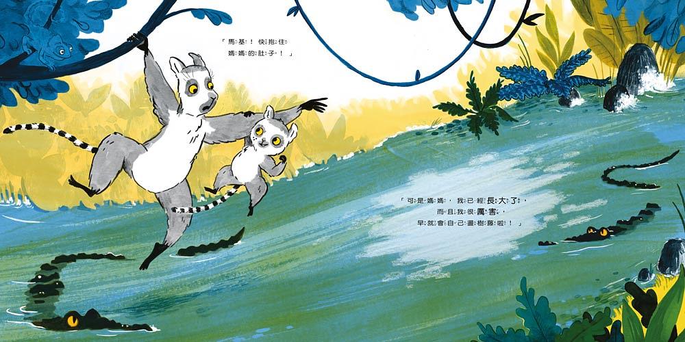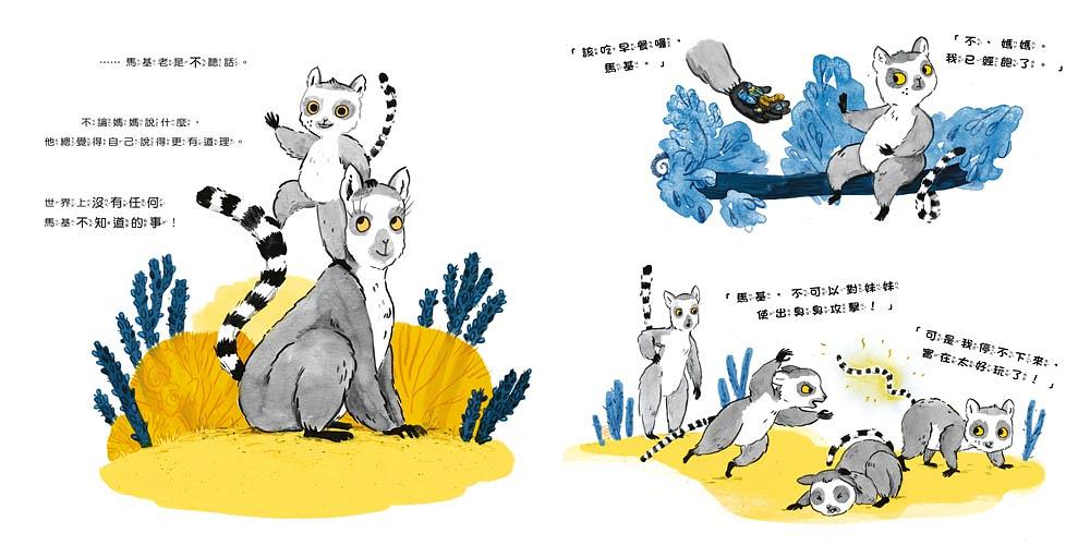 歡迎來到馬達加斯加!這群有著黑白相間的條紋尾巴、長得像浣熊、四肢纖細的小動物,名叫環尾狐猴!他們平常總是團體行動,白天一起曬日光浴、晚上一起窩在樹上睡覺,小狐猴馬基當然也不例外,不過有一件事,他和他的同伴很不一樣,那就是……馬基常常不聽話!