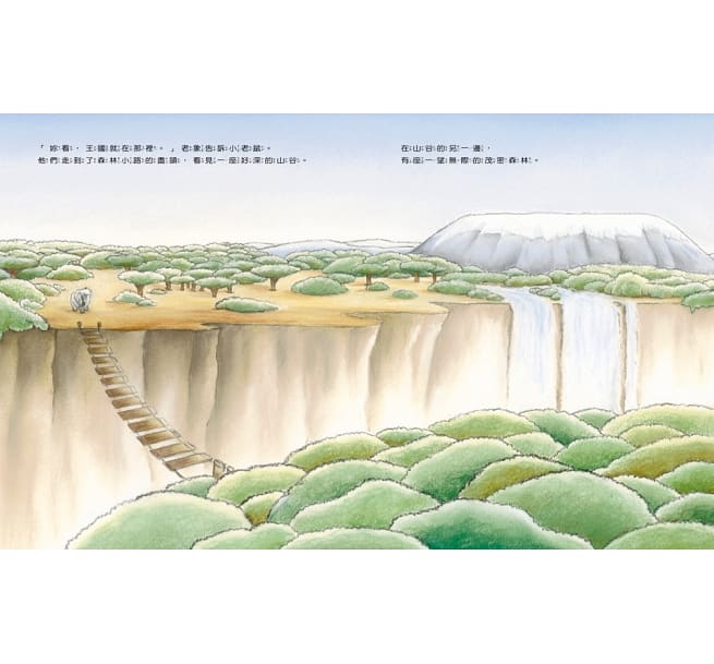 沒想到通往大象天堂的橋樑竟然斷了!當老象感到失望又難過的時候,小老鼠反而鼓勵起老象,答應要幫他修好橋梁,只要老象會再回來找她,但是老象告訴她,通往大象天堂的路,一旦出發,就不能再回頭。
