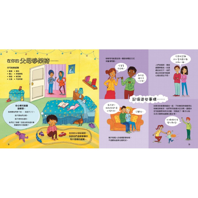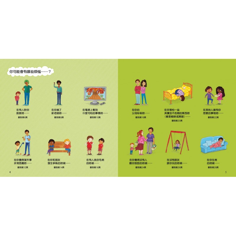 書裡的每個跨頁都會逐步引導孩子完成不同的煩惱場景,例如與朋友吵架,在學校遇到麻煩,或者感覺沒有人在聽他們說話。書中談論了孩子們的感受、他們可能會想到什麼,以及如何可以幫助他們感覺更好。透過有趣而生動的插圖,提供父母有關培養情感素養的溫和指導,以及幫助孩子們的簡單建議。這是一本很棒的書,可以幫助孩子們應對那些棘手的感受,並獲得對周圍世界的信心。