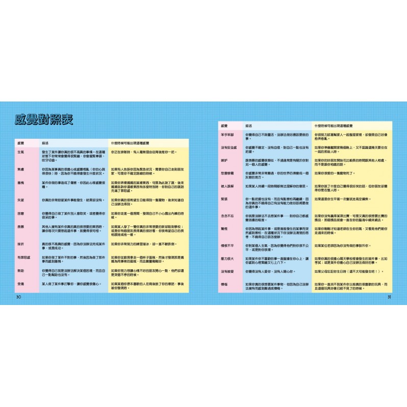 ★特別收錄「感覺對照表」與「家長指南」,提供父母親許多實用且有效的建議,引導孩子理解情緒與對應的生活實例,釐清自己在煩惱什麼?又有哪些方法能讓孩子不再感到焦慮煩憂。