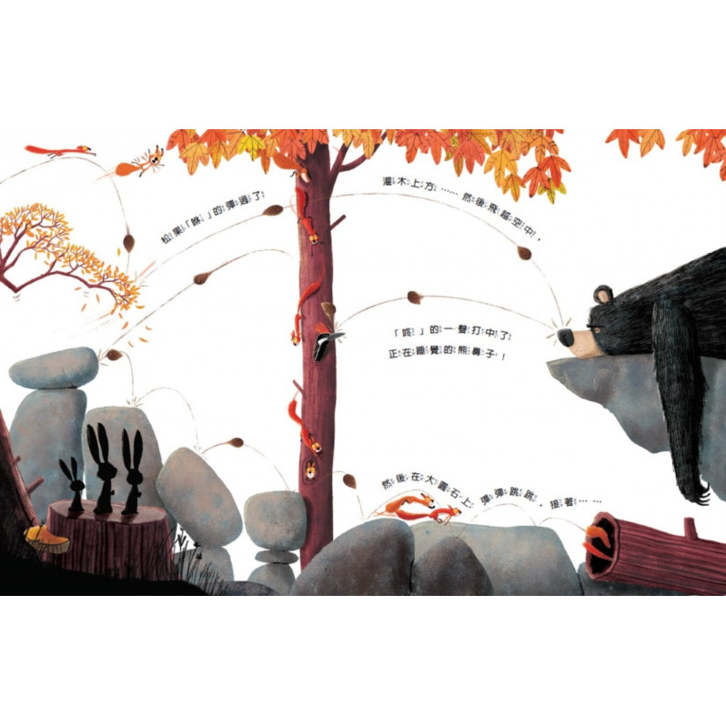 既然兩隻松鼠都認為這最後一顆松果是我的,牠們便上演了一場搶奪松果大作戰,一路從樹上爭搶到了河邊,吵得其他動物都不得安寧,最後到底是誰獲得了那顆松果呢?