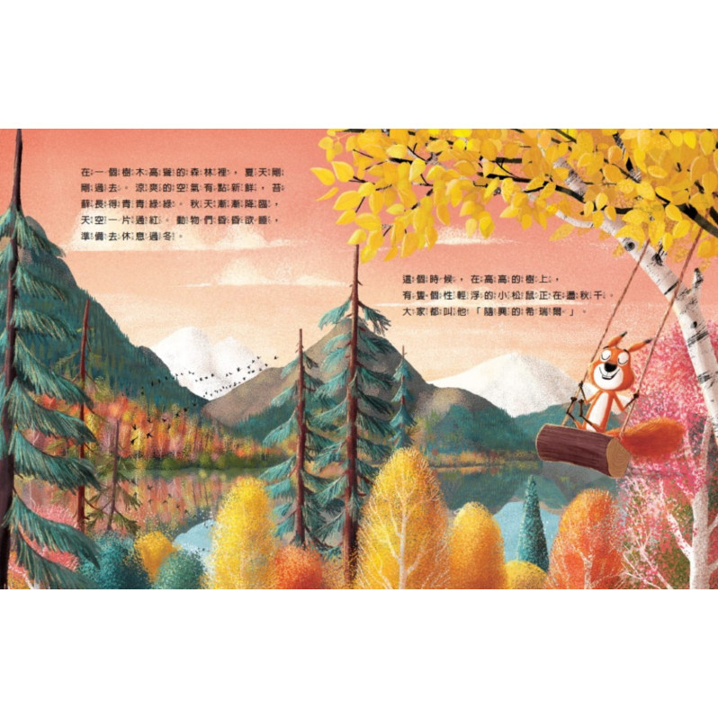 ★主角之一的希瑞爾是一個只享受當下、不為明天做準備的小松鼠,而另一隻布魯斯則是凡事都要充分準備的個性,就像寓言故事中「蟋蟀與螞蟻」的翻版,作者巧妙的結合寓言與新的故事走向,讓孩子學習互助合作與分享的概念。