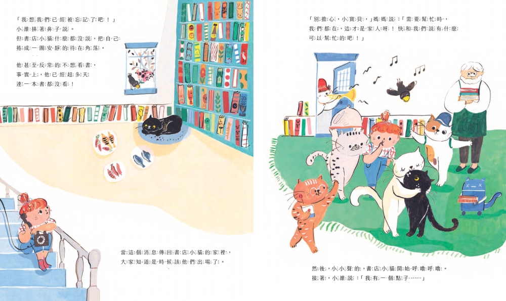 有了貓家人溫暖的支持和小女孩小維提供的好點子,書店小貓將重新迎接愛看書的孩子們,也終於能再次發出開心又滿足的呼嚕呼嚕聲。