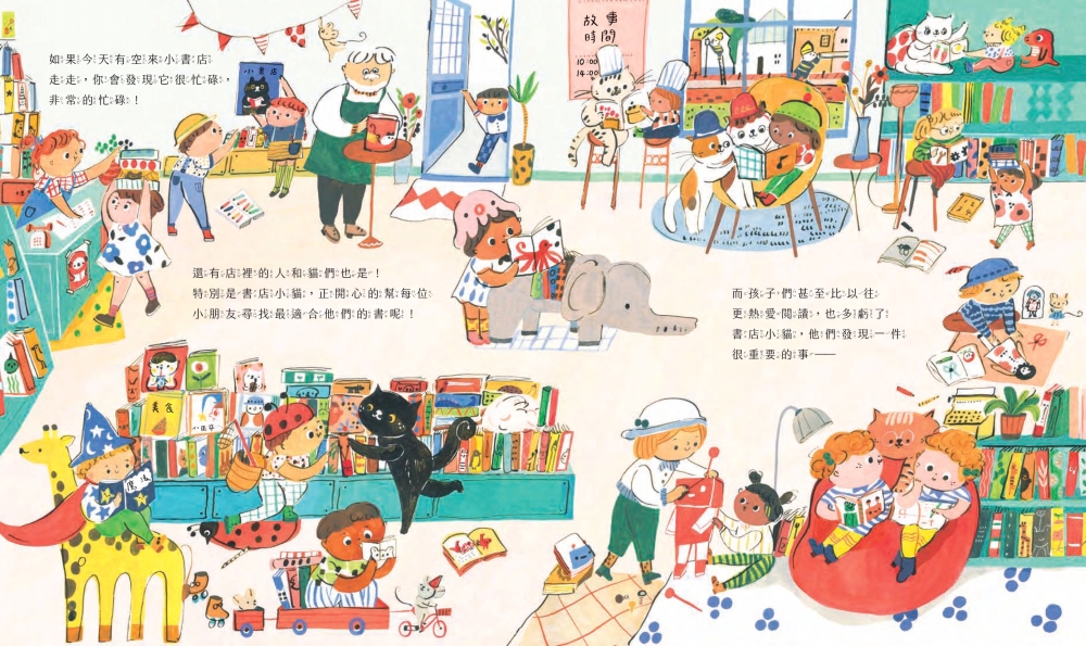 兒童小書店自從有小黑貓的加入後,變得熱鬧又忙碌,書店小貓正做著他最喜歡的事,一邊照顧小書店的每一個角落,一邊咻咻的搖著尾巴,當然,更重要的是,幫每位小朋友找到最適合他們的書,然後,發出滿足的呼嚕呼嚕聲。