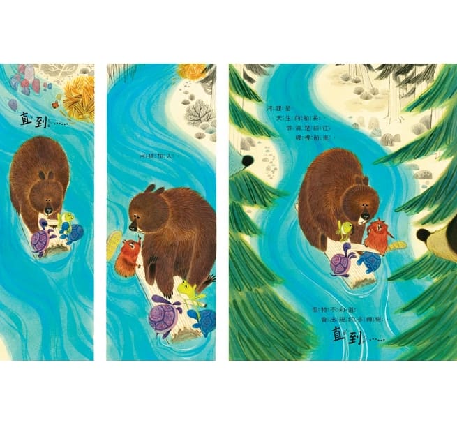 ▲繪者巧妙的運用翻頁,為這場驚險刺激的急流泛舟製造驚喜,完美的掌握了故事節奏。一群動物坐著浮木從遠處衝過來,搭配從遠景拉到特寫鏡頭的畫面,就像一幕幕流暢的動畫,臨場感十足。