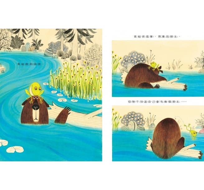 ▲故事一開始,森林、大熊和動物們都是孤寂的灰色,但隨著故事漸漸展開,畫面愈來愈繽紛,到最後,世界是彩色的。因為一條河,串起了友誼,不僅把大家連結在一起,也讓生活更豐富、更有活力、更有趣!