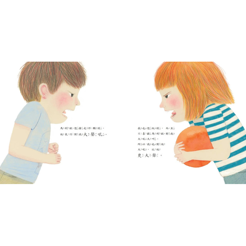 本書運用學齡前的孩子日常生活中可能經常發生的衝突情境──玩耍時的爭搶,生動描繪了衝突當下,孩子可能出現的語言、表情、情緒,甚至帶有暴力的肢體動作。接著,再由故事主角──4歲的卡拉和馬利歐,以及雙方家長溫柔的介入,帶出以蒙特梭利的教學精神為本,讓孩子學習如何非暴力的溝通、覺察自我的感受、表達想法但不指責、不動手。