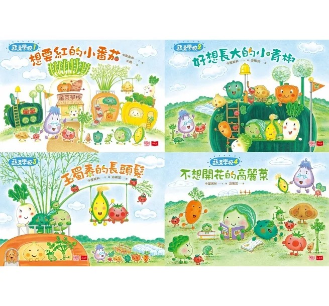 「蔬菜學校:讓孩子愛上蔬果不挑食」套書包含《蔬菜學校1:想要紅的小番茄》、《蔬菜學校2:好想長大的小青椒》、《蔬菜學校3:玉蜀黍的長頭髮》、《蔬菜學校4:不想開花的高麗菜》、《蔬菜學校5:草莓雙胞胎的煩惱》共五冊,適合親子共讀。