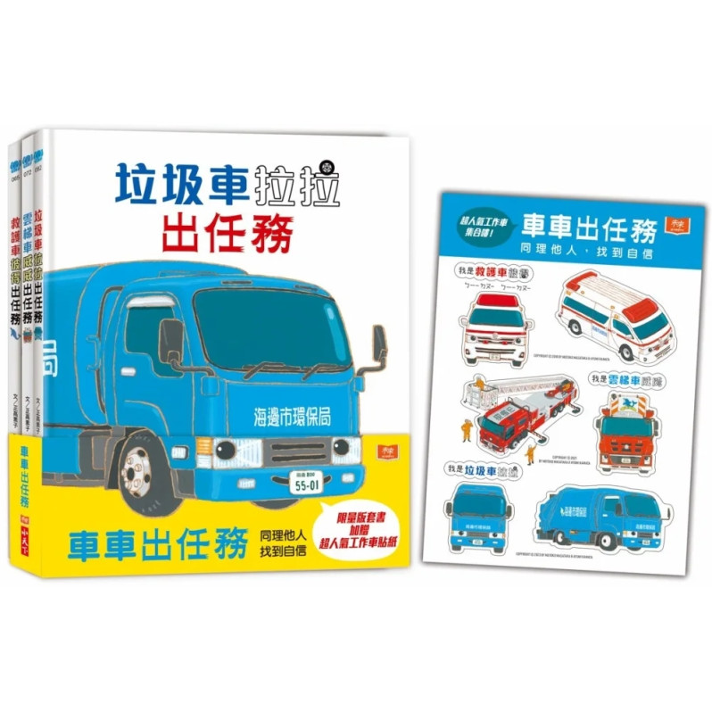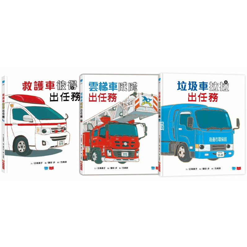 【超人氣車車出任務】系列讓孩子跟著垃圾車拉拉、救護車彼得、雲梯車威威一起出任務,了解各種工具車的用途,並學習體貼和助人的心情,認識自己的特長,並找到自己能發揮的地方。