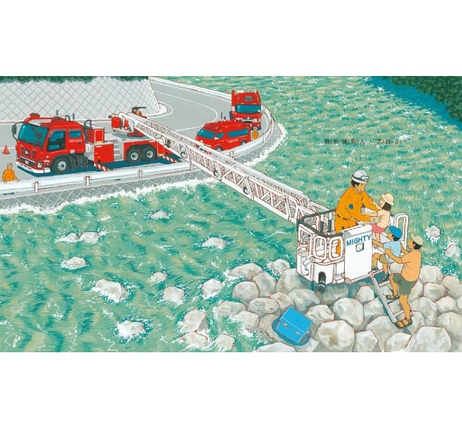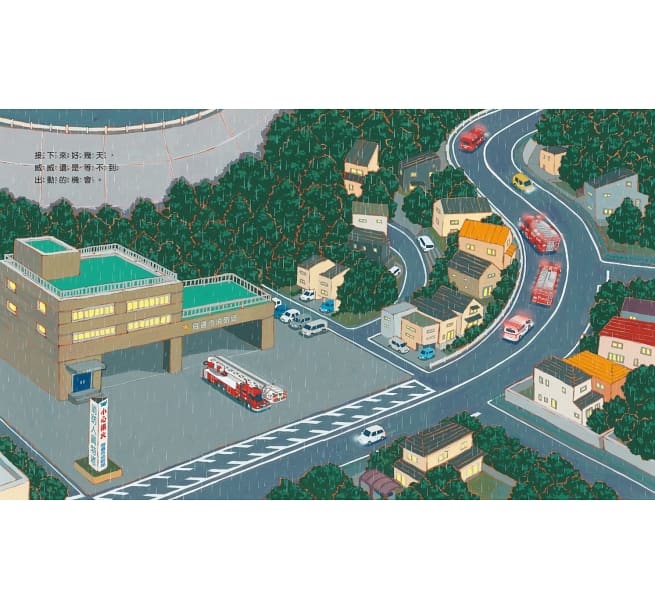 一次認識四種大小不同、任務不同的消防車——雲梯車、幫浦車、水庫車和指揮車,透過故事認識這些消防車的用途。