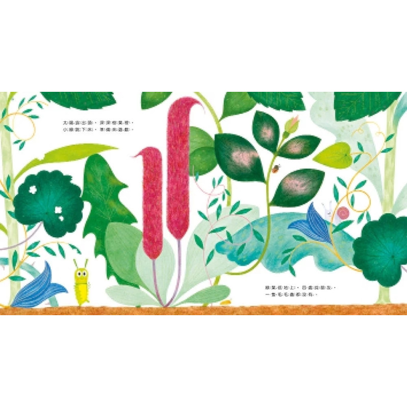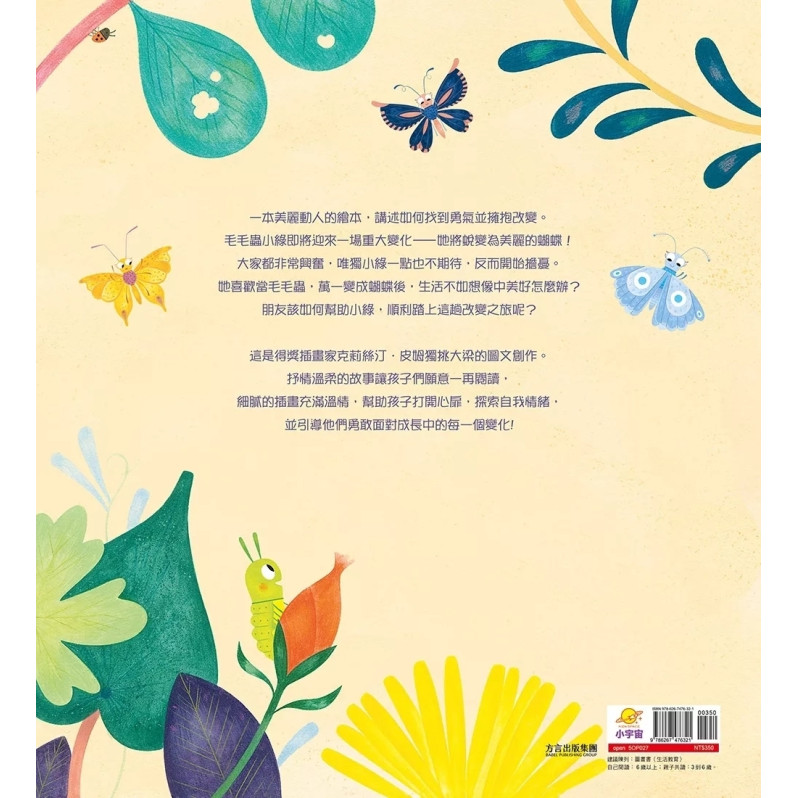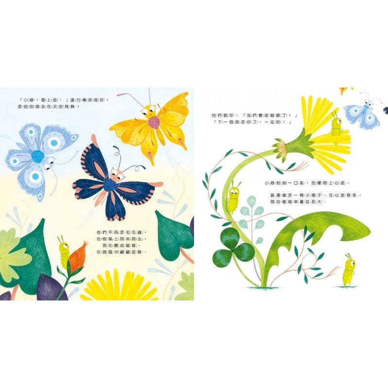大家都非常興奮,唯獨小綠一點也不期待,反而開始擔憂。她喜歡當毛毛蟲,深怕萬一變成蝴蝶之後,生活不如想像中美好怎麼辦?