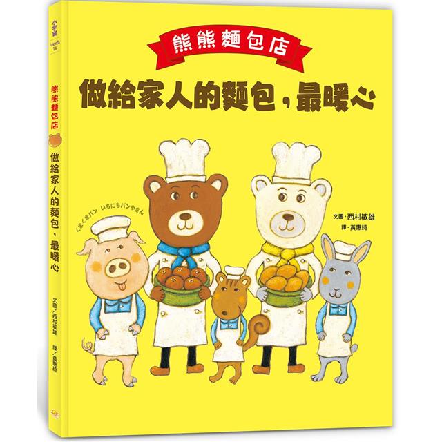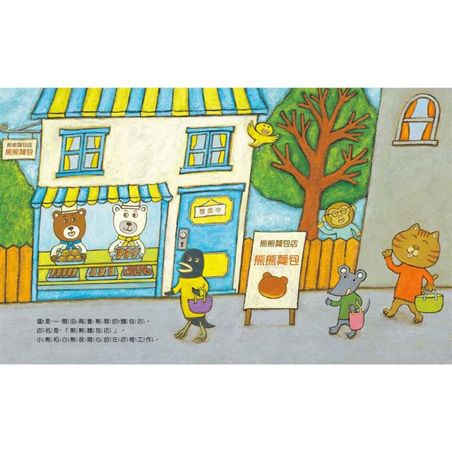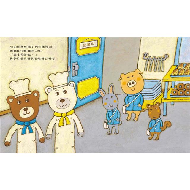 小動物參觀熊熊麵包店。小豬、小兔和小松鼠,迫不及待想看麵包的製作過程。「要不要試試看?」小熊和白熊邀請孩子們自己做麵包。