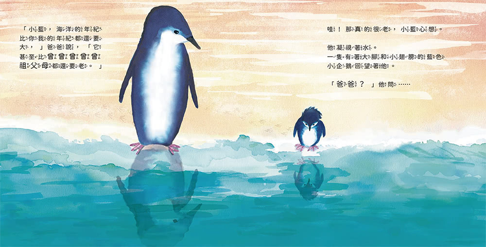 2.以大自然為靈感,柔和水彩渲染出寬闊的世界,跟隨企鵝父子一起探索五彩繽紛的水下世界,包括水母、海馬、海星、鯨鯊等海底生物!