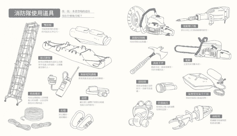 書末附「找一找遊戲」,帶孩子加深對消防道具的認識,包括雙節梯、捲式擔架、圓盤切割機、電動鑿子機、探照燈……了解道具的功能,以及救災時如何派上用場。