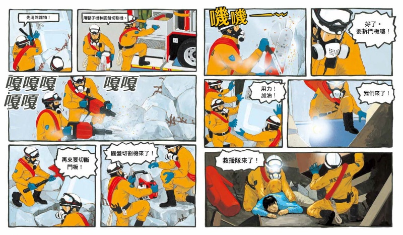 以連續兩個拉頁完整呈現救災全景,逼真程度宛如置身現場。