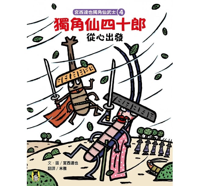 「獨角仙武士」是最喜歡昆蟲的宮西達也,第一次在臺灣登場的新角色。主角從一、二集的獨角仙三十郎,傳承到三、四集的獨角仙四十郎,充滿時代感的場景,以及主角們生動活潑的對話,讓讀者彷彿看了一部武俠電影般的回味無窮。這次獨角仙四十郎,要帶大家一起想想「真的有人是天生的壞人嗎?」以及「曾經傷害你的人遇到困難時你會怎麼做?」,相信在閱讀完之後,你也會和天牛阿三一樣,找到屬於自己的答案喲!