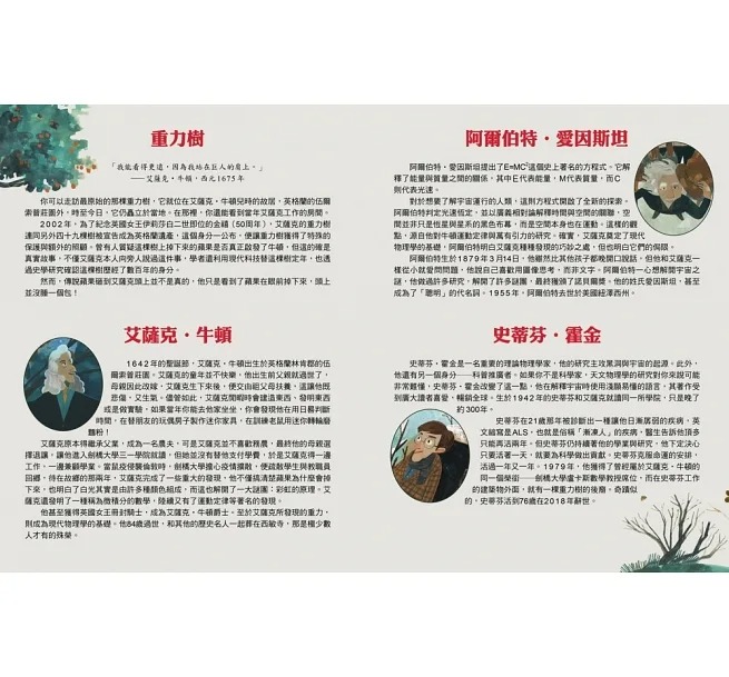 本書最後附有牛頓、愛因斯坦和霍金的介紹,以及重力樹的相關資訊、牛頓生平大事年表,讀完繪本後,透過這些資料,更加了解歷史傳奇人物的背景。