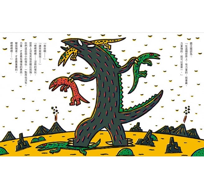有一天,兩隻巨獸龍發現了這群三角龍寶寶,也想一口吃掉他們!為了保護三角龍寶寶,霸王龍用力地、緊緊地抱住他們,不論巨獸龍如何攻擊,他都動也不動。他忍著痛,一邊喃喃自語:「我終於懂了,最重要的並不是力量很強,最重要的東西是……」