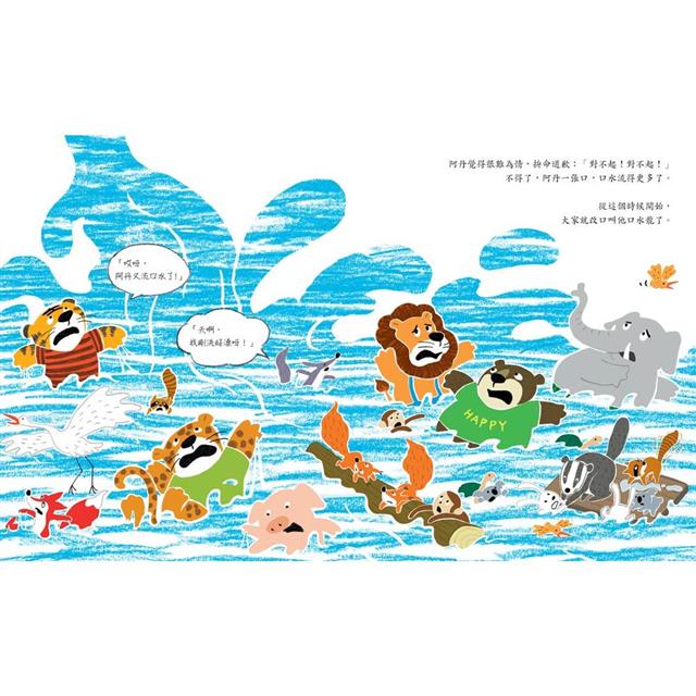 口水龍獨自住在藍色海邊,但其實,他是前幾天剛搬來的,而且他也不怎麼喜歡海。他很懷念從前住在彩霞森林的日子和那群可愛的朋友。那時,他還不叫口水龍,他的名字是——阿丹……