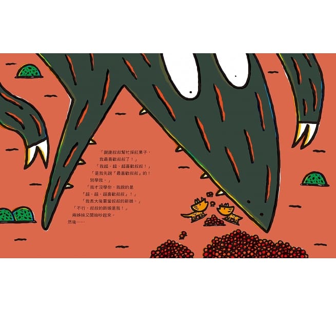 「叔叔,你怎麼還不快點來呢?你一定會說『嘿嘿嘿嘿嘿,看起來好好吃』。」三角龍姊妹咚咚咚搖著紅果子樹,等著霸王龍來共享。