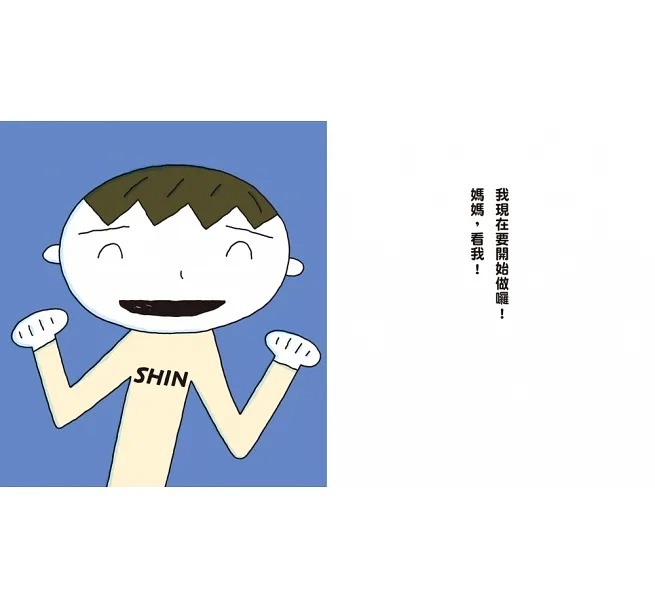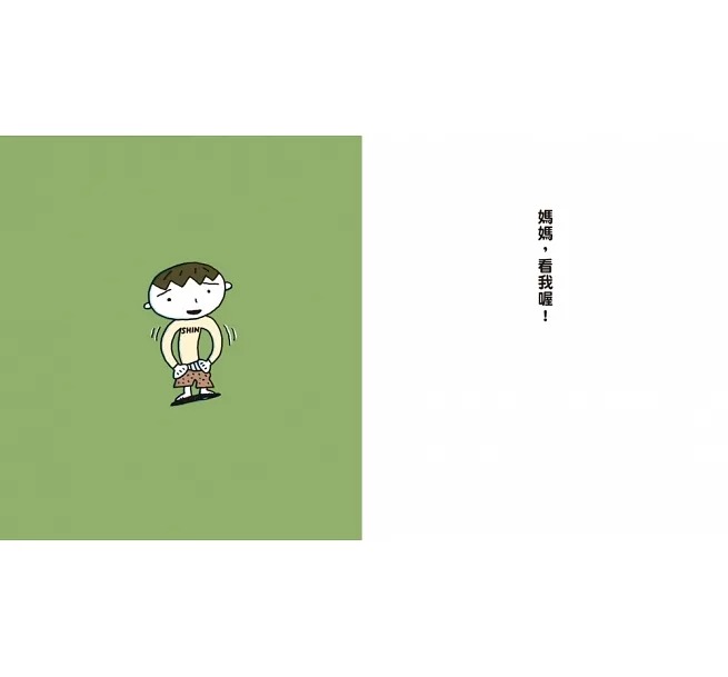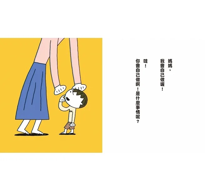 本書從頭到尾,畫面中的媽媽都只出現下半身。這樣一來,閱讀角度就會和小男孩同高度,看著這個孩子的每個動作、表情,以及他要做的事情,就如同本書希望媽媽也能一直關注孩子。