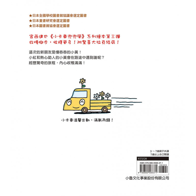 本書為《小卡車兜兜風》系列新作。這次與小紅一同送貨的是總是行事悠哉卻也熱心助人的小黃。朝著目的地悠遊水族館出發,看到小黃總是給予困難的車子們幫助、因為小黃的緩慢而得以享受美麗的風景,小紅的心境也漸漸改變……慢慢來,能夠飽覽更多沿途風光;慢慢來,也很不錯!