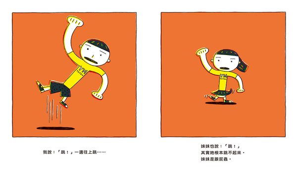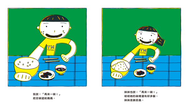 你家也有跟屁蟲嗎?弟弟妹妹總愛跟在哥哥姐姐的身後,模仿每個行為,只不過……他們卻總是學不好,還製造了更多麻煩!宮西達也的《小小跟屁蟲》正是以手足的互動為主題,他特意將哥哥和妹妹分別繪製於左右圖的方框中,對比出妹妹緊黏在哥哥身旁,不論吃飯、看書、上廁所等大小事,都急於模仿他的一舉一動。