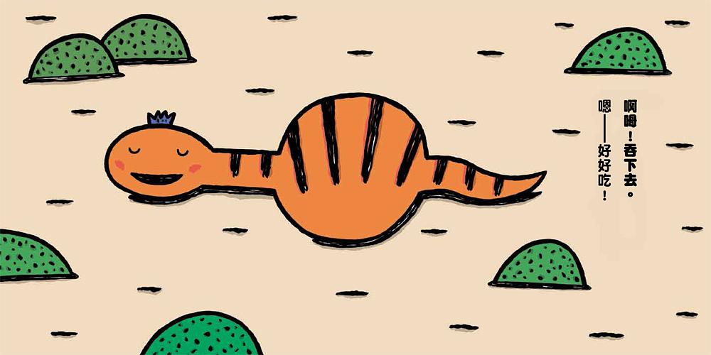 肚子咕嚕叫的小蛇,扭哇扭哇扭,就在散步的時候……他遇上圓圓的蘋果,彎彎的香蕉,三角形的飯糰,尖尖的鳳梨,面對色澤飽滿、形狀各異的食物,小蛇總是毫不猶豫地一口吞下,每當飽餐一頓後,小蛇彎彎的眼睛和咧嘴笑的表情呈現出「一口吃下」食物的滿足與幸福。