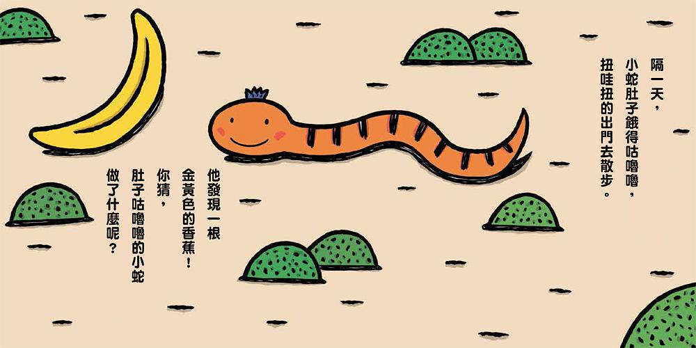 簡單、重複的語句帶動情節往前推展,帶來可預期性,吸引孩子緊緊跟隨,專注聆聽,也隨著小蛇出人意表的舉動驚呼歡笑!
