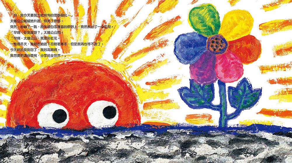冬天的白雪剛融化,彩虹花就迫不及待地從地底長出來,跟太陽公公打招呼。一隻小螞蟻經過,正煩惱著該如何渡過大水窪,彩虹花很慷慨地提供了一片花瓣,給小螞蟻當成小船划水窪。而小蜥蜴想去參加宴會,但是沒有適合的衣服,彩虹花也摘了自己的花瓣給小蜥蜴當作禮服……就這樣,越來越多小動物跑來找彩虹花幫忙,彩虹花的花瓣一片一片地減少,下雪的季節又要來了,沒有花瓣的彩虹花,該如何度過這個冬天呢?