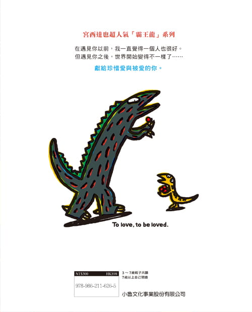 內容介紹: 宮西達也超人氣「霸王龍」系列 獻給珍惜愛與被愛的你 107年度臺北市國小兒童深耕閱讀計畫好書 在遇見你以前,我一直覺得一個人也很好, 但遇見你之後,世界開始變得不一樣了…… 奸詐又狡猾的傷齒龍,沒有朋友與家人。從來沒有愛過誰,也沒有被愛過。 一天,傷齒龍撿到了一顆蛋,為了獨吞這顆美味的蛋,他開始了撫養蛋的生活。 而在孵育蛋的過程中,傷齒龍冷酷的心,漸漸的被蛋裡的小生命融化了……