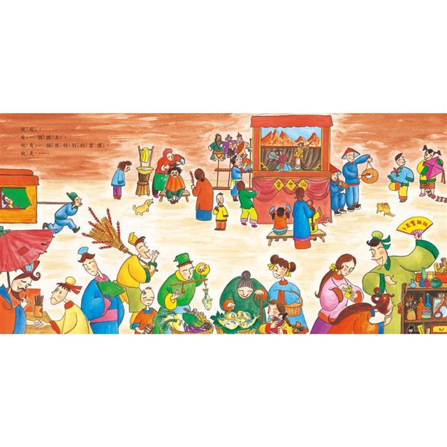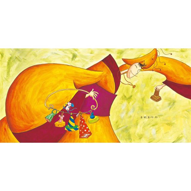 故事背景雖發生在古代朝廷,但繪者突破框架限制,將國王、王后、宮女、王子等等的形象畫得活潑可愛;運用鮮明的色彩將純真如孩童的國王內心世界,具體呈現在畫面中的各個角落。