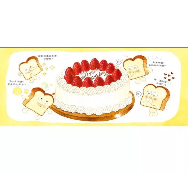 一大早,各種麵包按照名牌各就各位,開啟麵包店充滿朝氣的早晨!不過,他們全都好羨慕櫥窗裡光耀動人的草莓鮮奶油蛋糕。吐司不明白,為什麼蛋糕白皙又光滑,扎實又綿密,高貴又華麗,自己卻這麼沒特色?螺旋麵包、麻糬麵包、菠蘿麵包叔叔、可頌婆婆、泡餅婆婆紛紛前來安慰,卻被吐司句句反駁,直指痛處,大家的自信心都大受打擊!