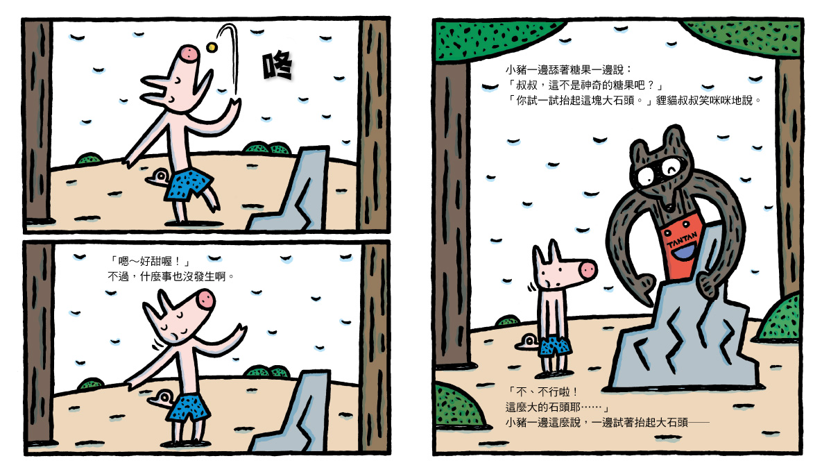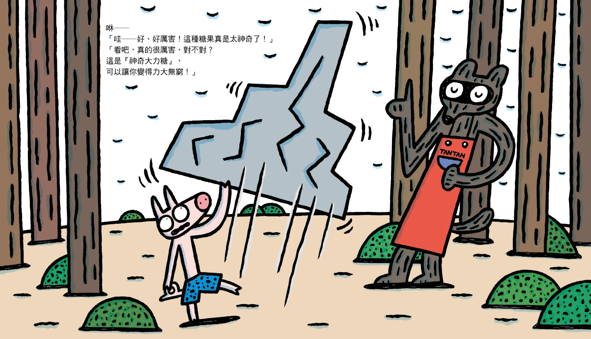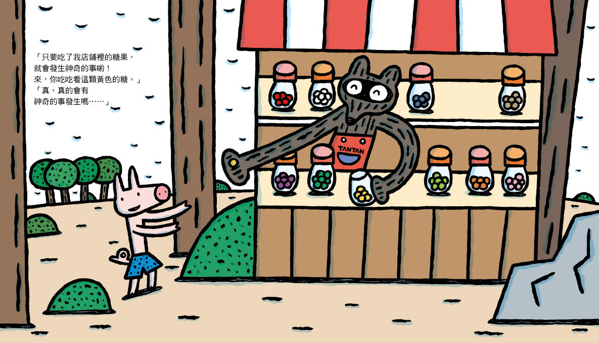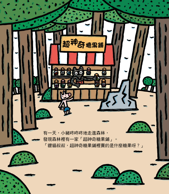 內容介紹: 歡迎光臨超神奇糖果鋪! 裡面有各式各樣的糖果, 每種糖果都有不同的神奇功能, 歡迎大家來試吃! 小豬走進「超神奇糖果鋪」,試吃了各式各樣的糖果, 有「神奇大力糖」、「神奇獅吼糖」…… 哇!還有吃了就能變成大野狼的糖果呢! 吃了超神奇糖果後,小豬偽裝成大野狼到處惡作劇, 正當小豬得意地哈哈大笑時, 真正的大野狼卻突然出現了……