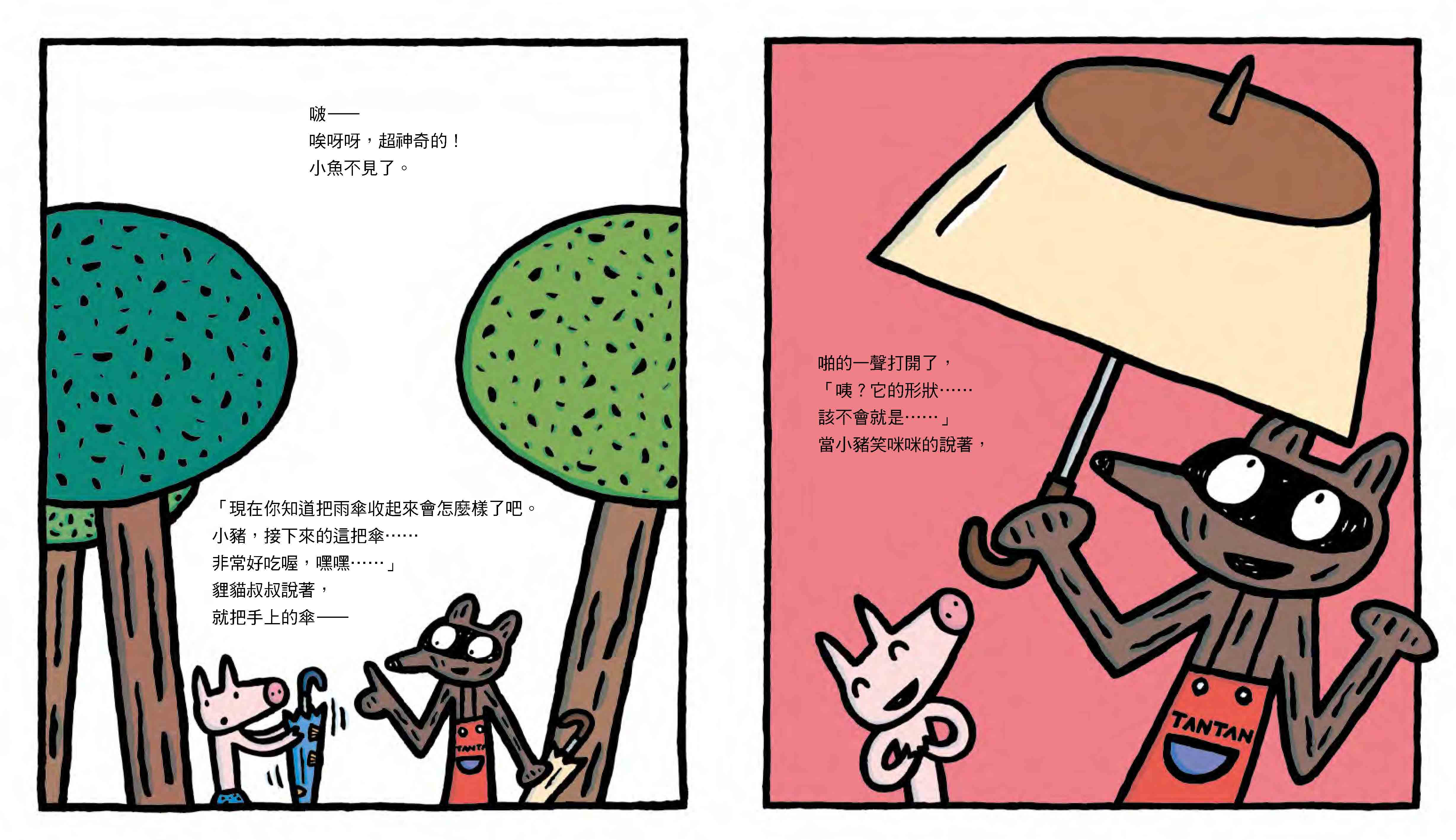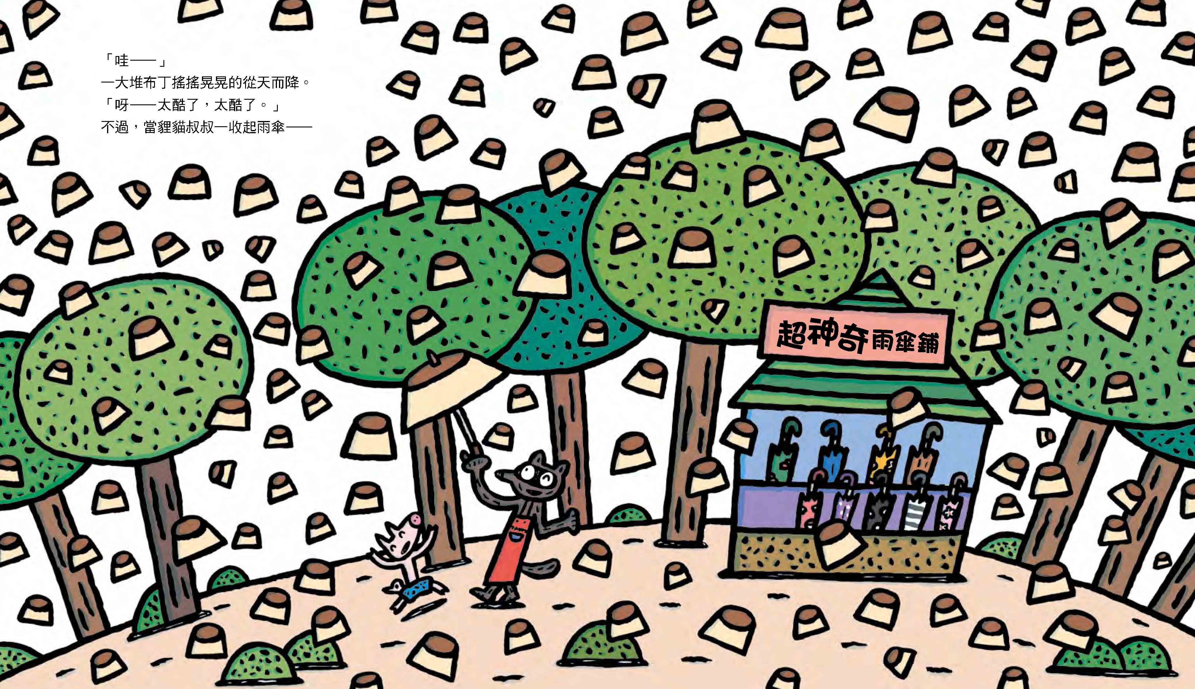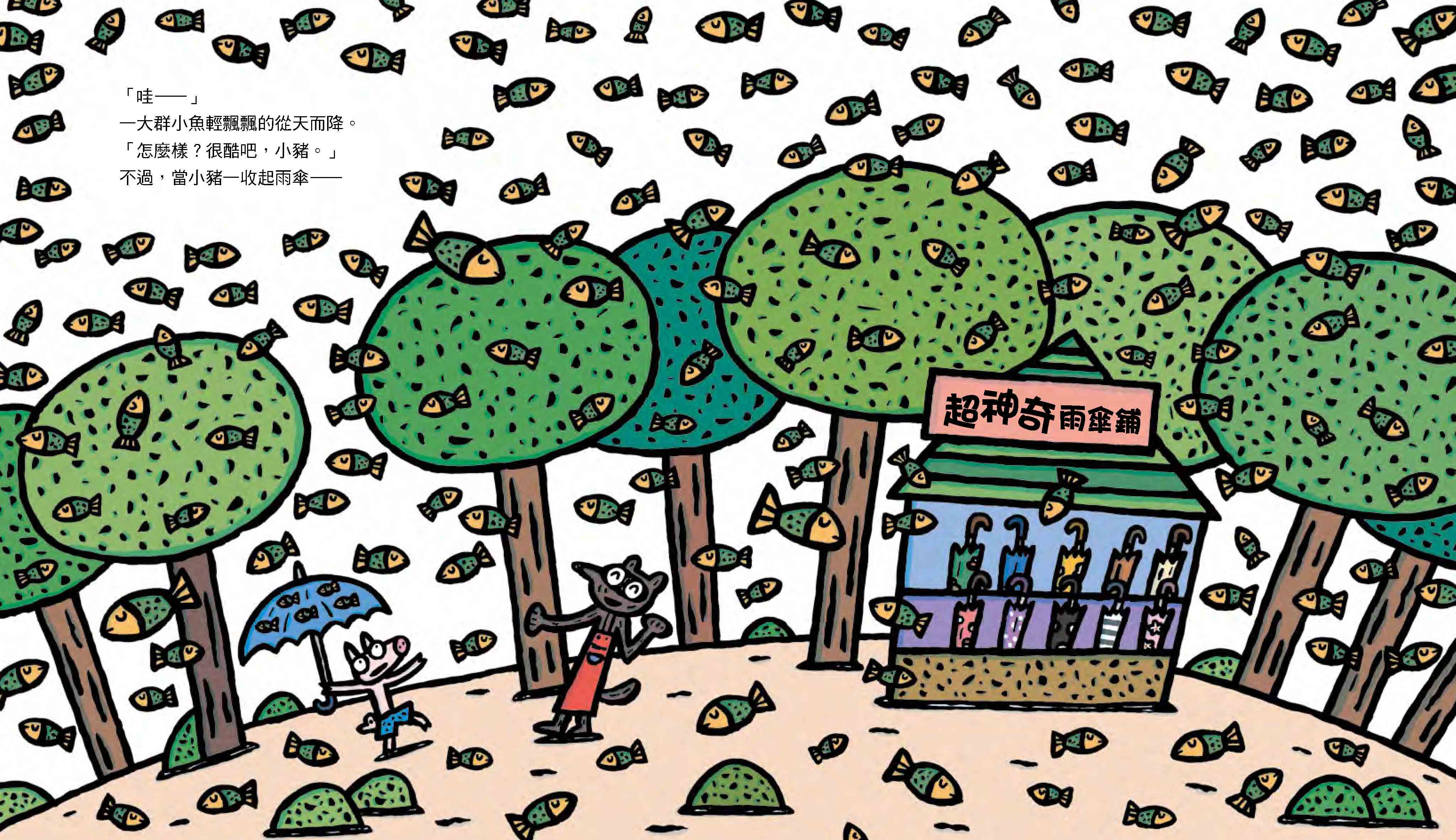 有一天,小豬咚咚咚地走進了森林,發現貍貓叔叔開了一家「超神奇雨傘鋪」,裡面每一把雨傘都有不同的神奇功能,打開和收起也有不同效果喔!例如,有小魚圖案的藍色雨傘,打開會掉下好多可愛的小魚;有布丁造型的黃色雨傘,打開會掉下好多搖搖晃晃的布丁;有壽司圖案的紅色雨傘,打開會掉下好多美味的壽司。但如果把傘收起來,這些東西就會瞬間消失!真是太神奇了!小豬離開之前,貍貓叔叔給了他一把有白色斑點的黑色雨傘,打開之後會下掉什麼呢?