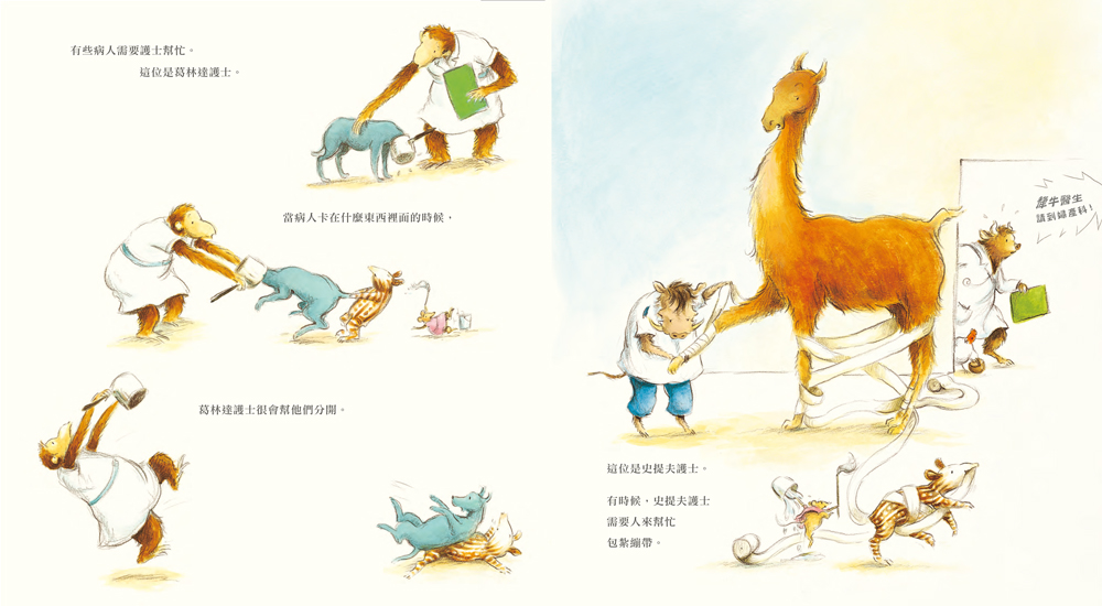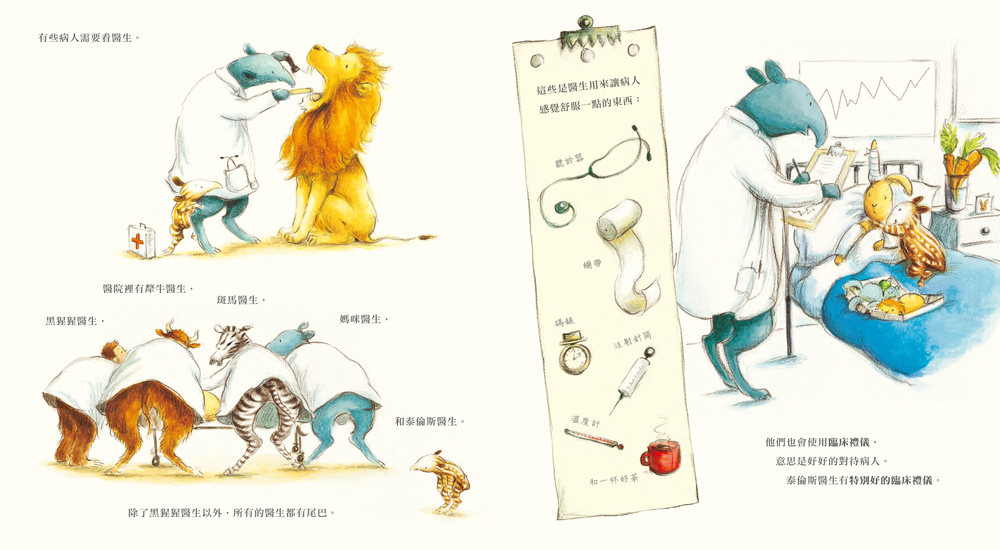 在雪倫.任塔老師細膩的筆觸之下,打造出溫馨又可愛的動物醫院,能夠消除孩子們心中對醫院總是感到冰冷又恐怖的刻板印象。