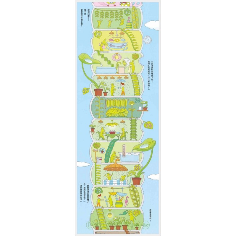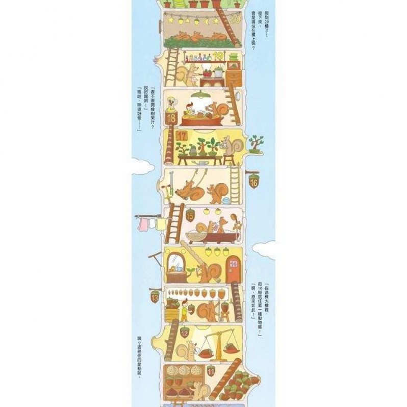 原來,在這棟奇妙的建築裡,每隔十層樓,就是一種動物的家呢!松鼠、瓢蟲、青蛙、蜜蜂⋯⋯仔細看,每層樓都有不同的布置、也都代表了主人的個性喔!那⋯⋯住在第100層樓的,到底是誰呢?